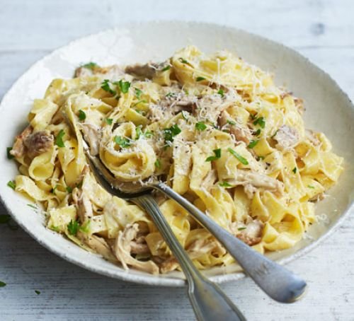 Chicken cooked in a creamy sauce served on a bed of pasta